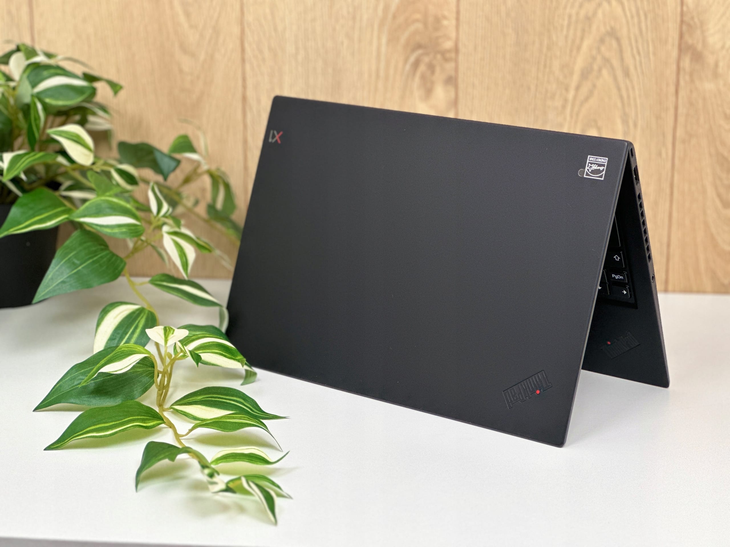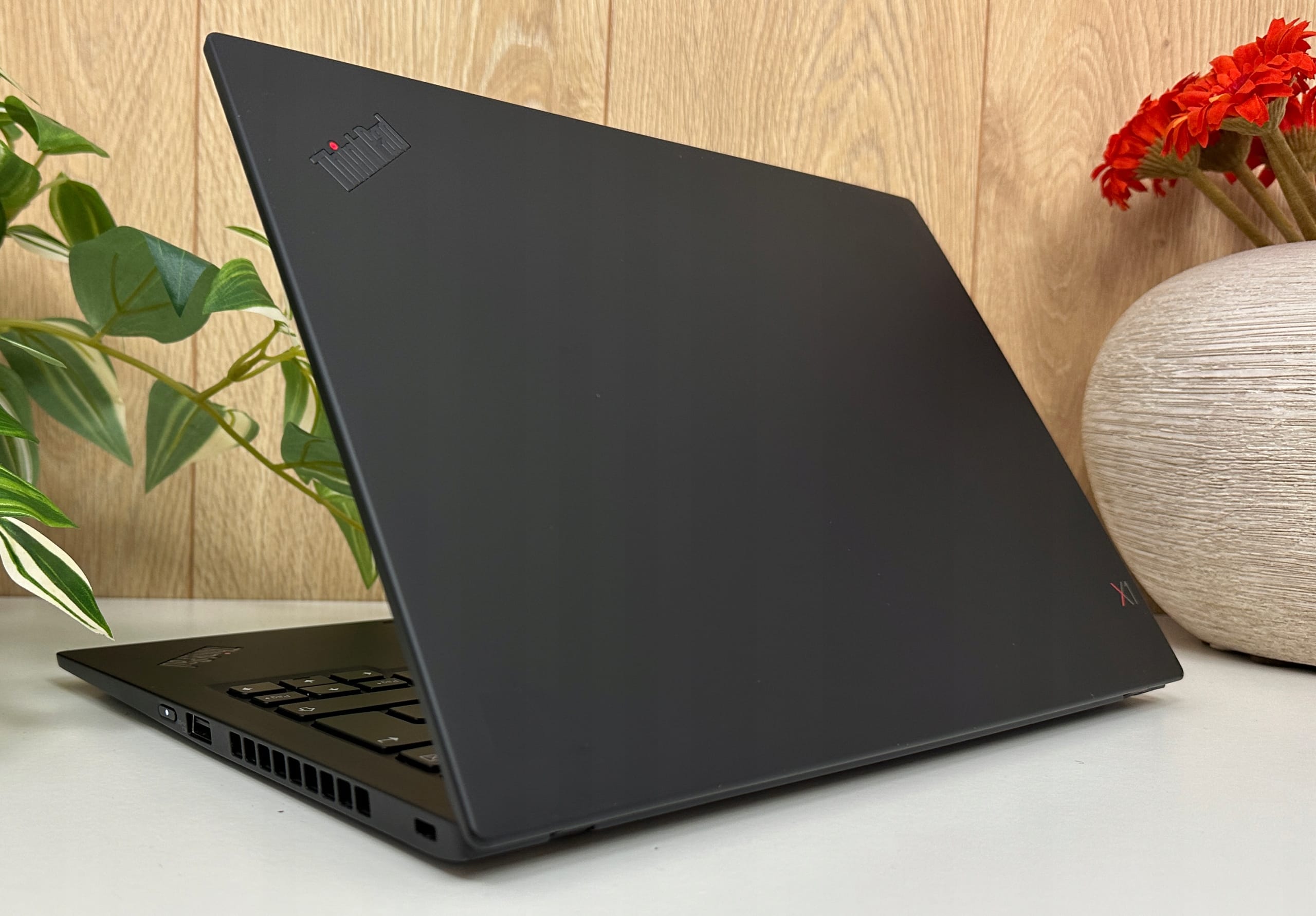 Lenovo ThinkPad X1 Carbon 8. generacji to lekki i wytrzymały laptop, wykonany z aluminium i węgla, który łączy elegancki wygląd z solidnością. Jego minimalistyczna konstrukcja z matową gumową obudową jest wygodna w użytkowaniu i doskonale się prezentuje.